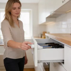 Ich liebe es, wie versteckt sie sind. Gäste bemerken nichts, aber unser Sohn kann die Medikamentenschublade nicht öffnen. Die Montage für alle vier Schlösser hat vielleicht zehn Minuten gedauert.
