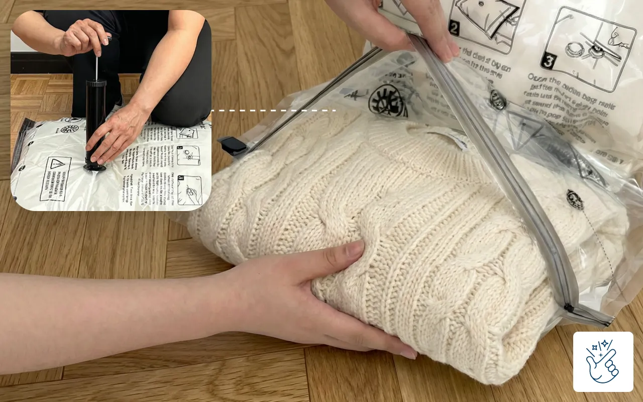 Füllen Sie die Ortorex-Tasche und verwenden Sie dann die Pumpe, um schnell die Luft zu entfernen. Ihre Pullover und Bettwäsche werden mit minimalem Aufwand schnell flach.