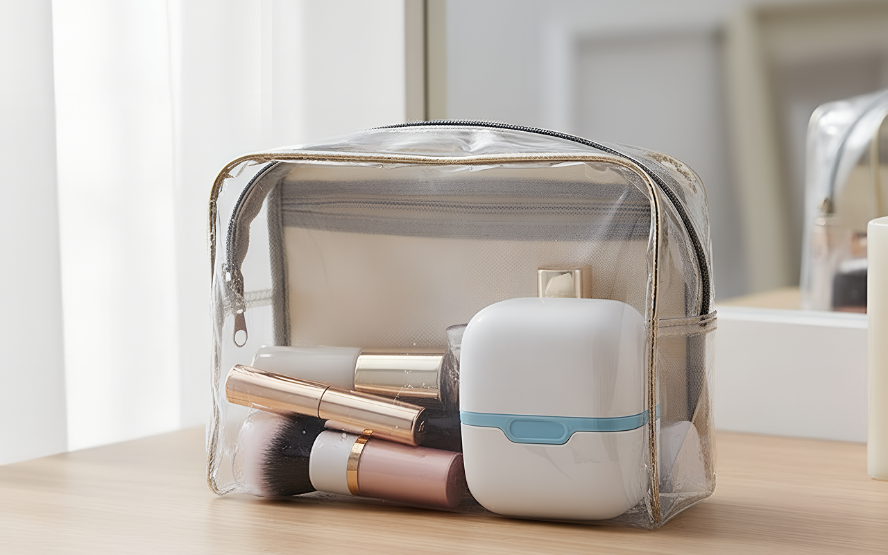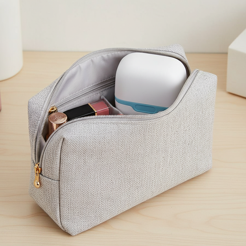 Ich bewahre den Eisroller in einer kleinen Tasche für Reisen auf. Nach Flügen fahre ich damit über mein müdes Gesicht und alles wird wieder schön straff.