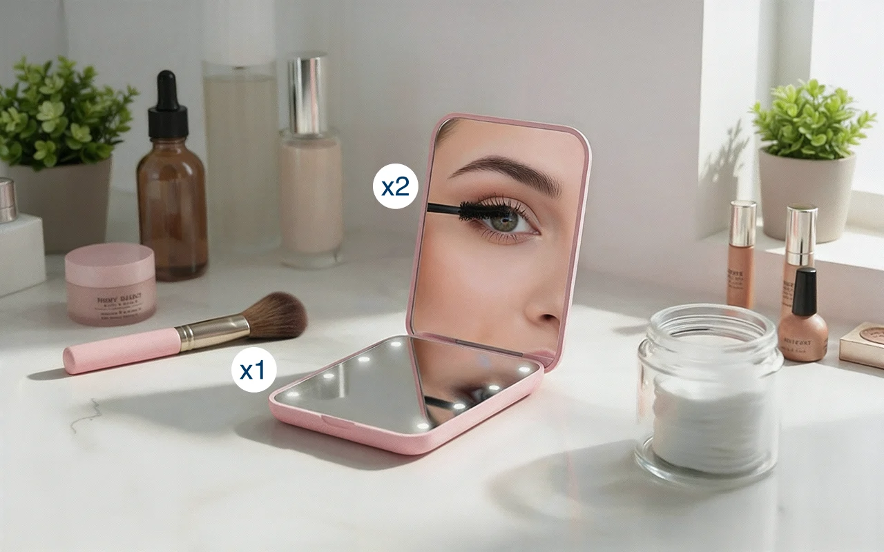 LED-Lichter leuchten hell und erleichtern das Auftragen von Kosmetika. Die Sichtbarkeit verbessert sich sogar in dunklen Räumen für höchste Präzision.