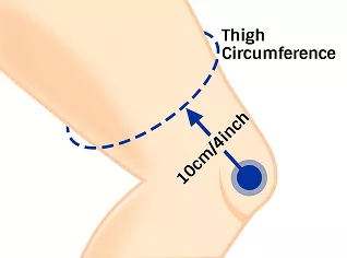 • 1. Beugen Sie Ihr Bein in einem 30°-Winkel und messen Sie den Umfang Ihres Oberschenkels 10 cm (4'') über Ihrer Kniescheibe.