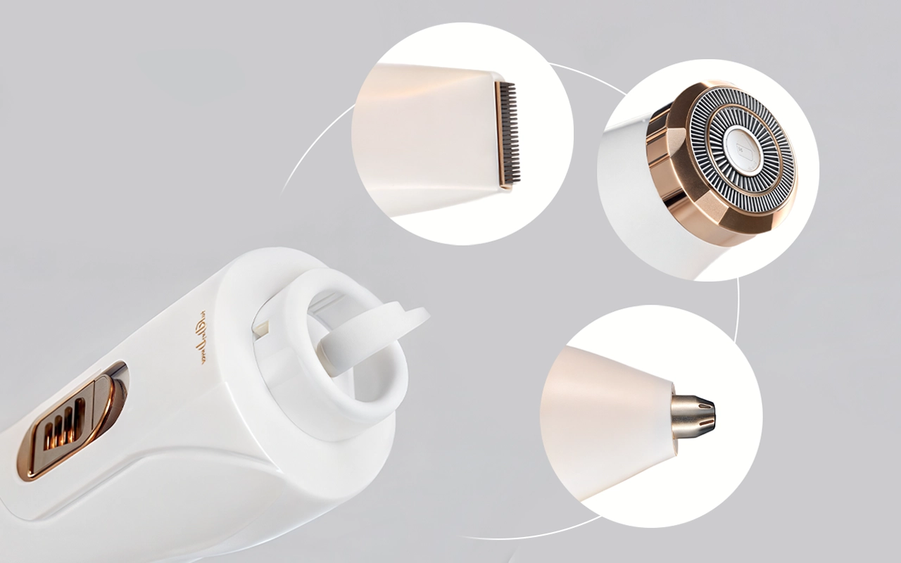 Drei Aufsätze sorgen für Gesicht, Achseln, Beine und Bikinizone. Ein kompaktes Gerät passt überall hinein und ermöglicht müheloses Styling an jedem Ort.