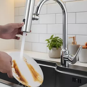 Keine Spritzer mehr! Ich kann in einer Sekunde von einem sanften Spülgang für Obst zu einem starken Strahl für Pfannen wechseln. Selbst meine Kinder können ihn bedienen.