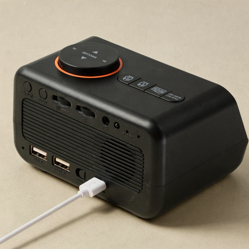 Überprüfen Sie Temperatur, Luftfeuchtigkeit und Kalender, wann immer Sie hinüberschauen. Zwei USB-Anschlüsse machen das Laden von Geräten schnell und unkompliziert.