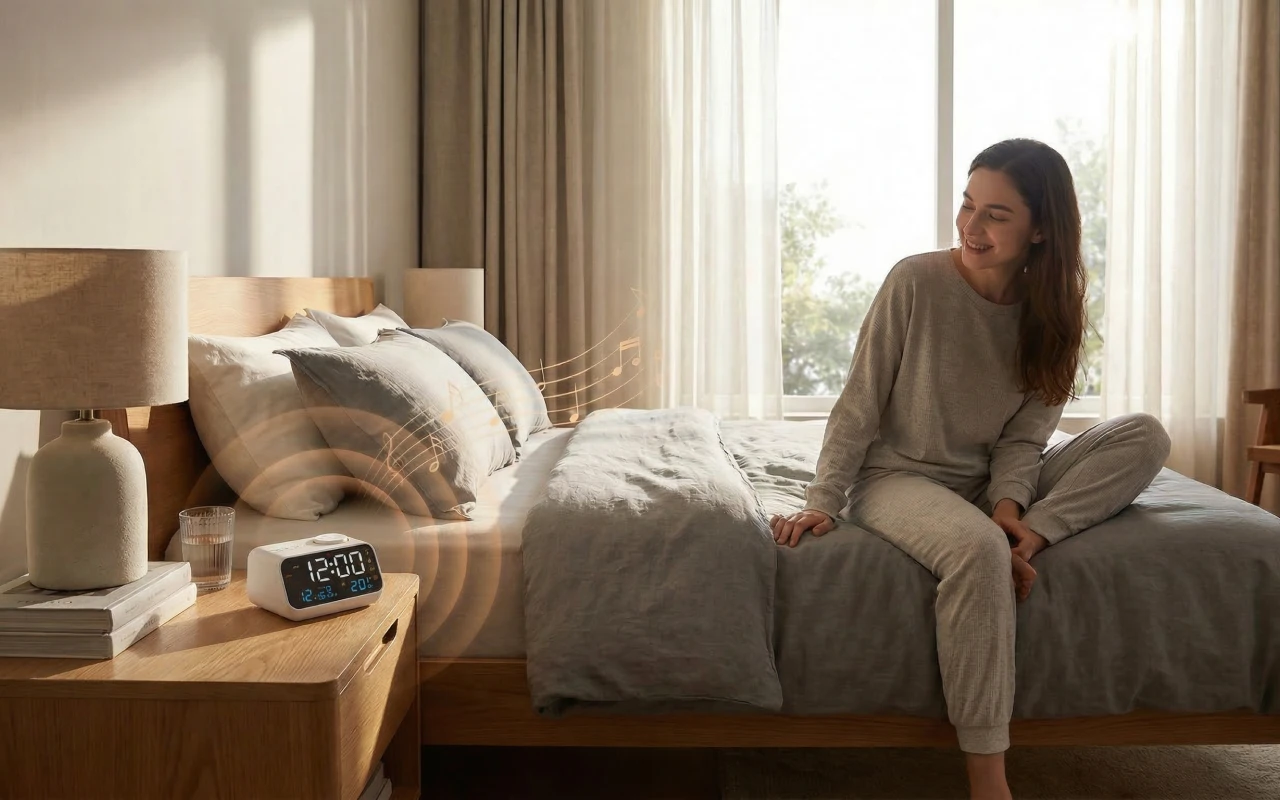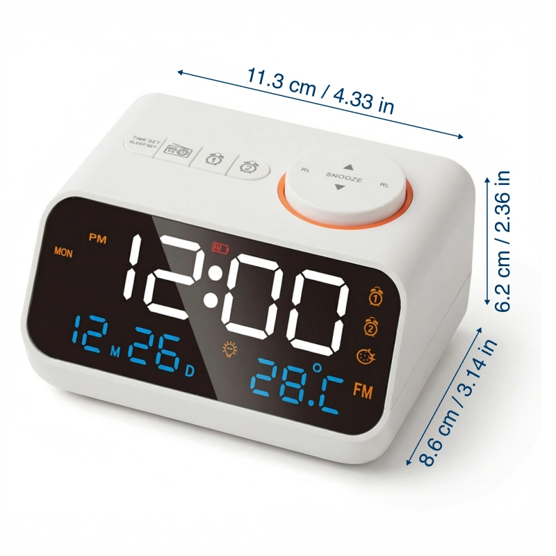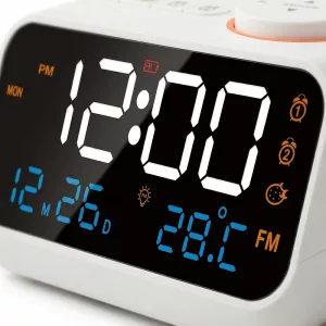 Stellen Sie zwei getrennte Alarme ein, um Routinen einfach und zuverlässig zu halten. Wählen Sie sanfte Musik oder lebhaftes Radio, um ruhig und bereit in den Tag zu starten.