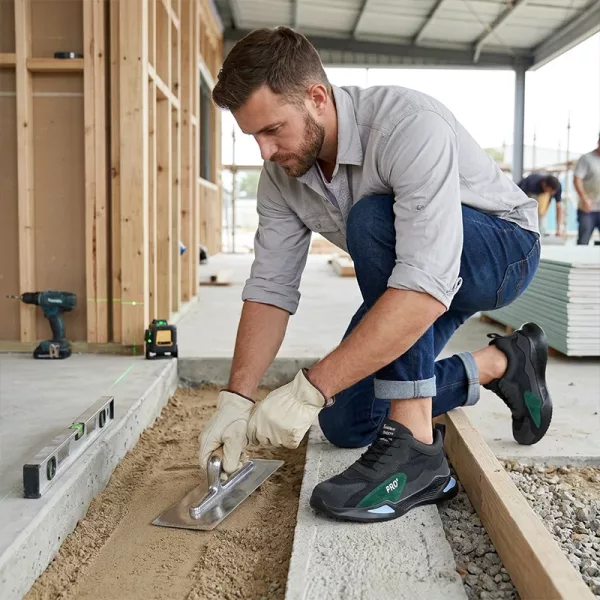 Habe diese Schuhe für meinen Mann auf Baustellen gekauft. Er liebt, wie leicht sie sind, und die Zehenschutzkappe hat ihn gerettet, als ihm eine Bohrmaschine von einer Leiter gerutscht ist.