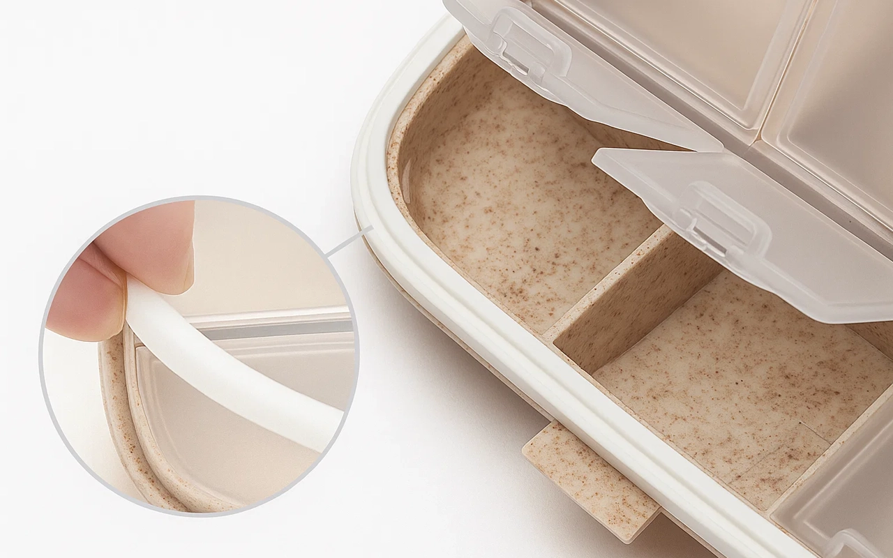 Diese kleine Pillendose fasst alle meine Medikamente für eine Woche. Die sicher einrastenden Fächer sorgen dafür, dass nichts ausläuft, selbst im vollen Koffer.