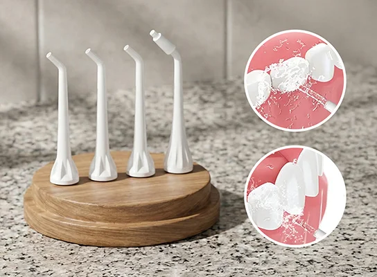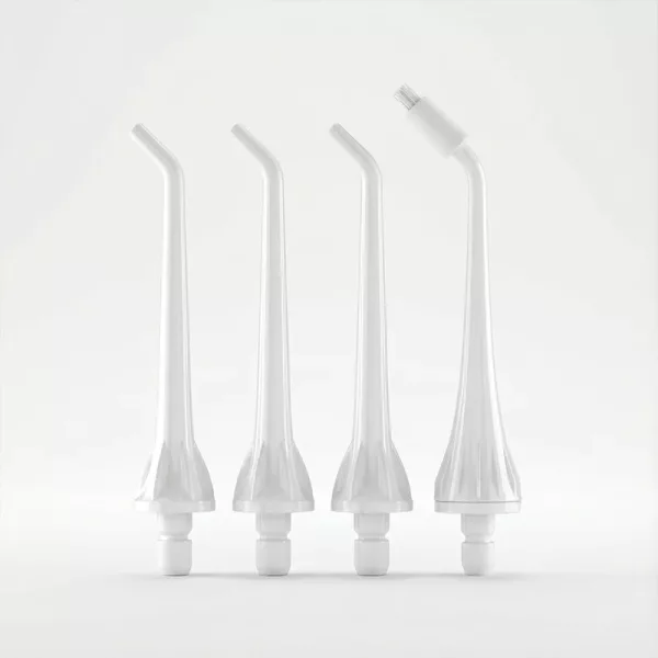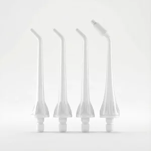Die Ortorex-Munddusche enthält drei Düsen für die regelmäßige Reinigung und einen Zungenschaber.