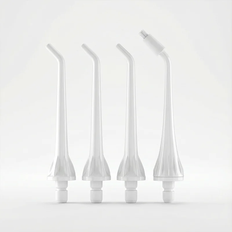 Die Ortorex-Munddusche enthält drei Düsen für die regelmäßige Reinigung und einen Zungenschaber.