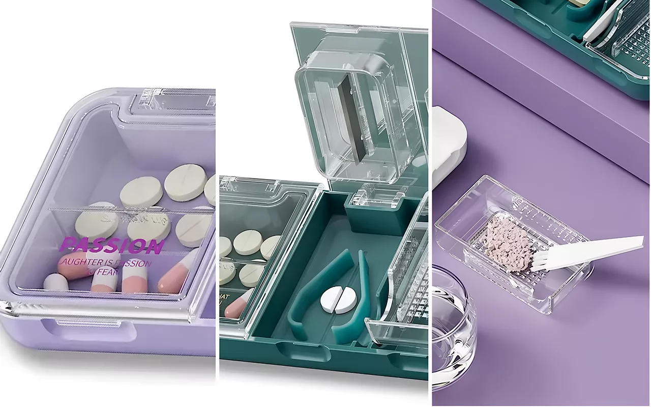 Drei Hauptfunktionen vereinen sich in einem einfachen Gerät. Tabletten aufbewahren, teilen und zerkleinern – ganz ohne Aufwand oder Unordnung.