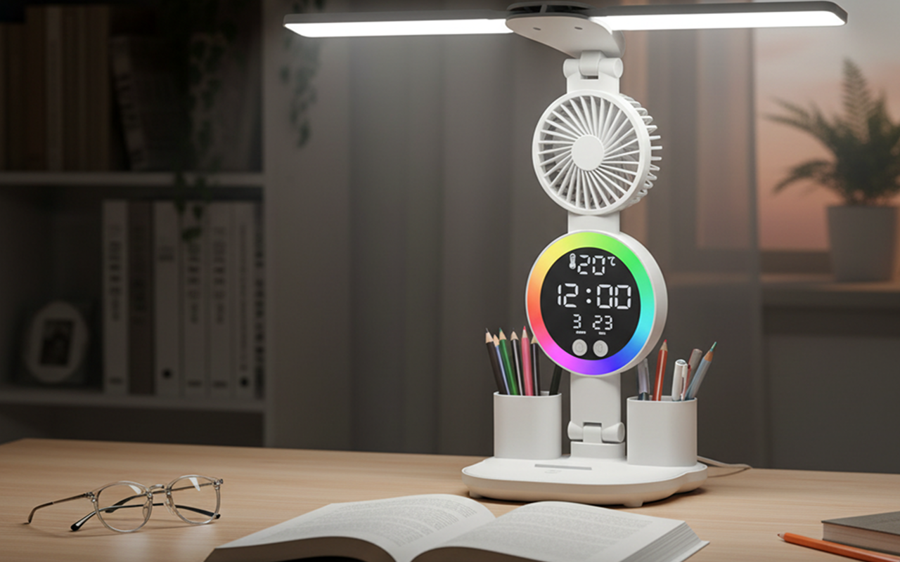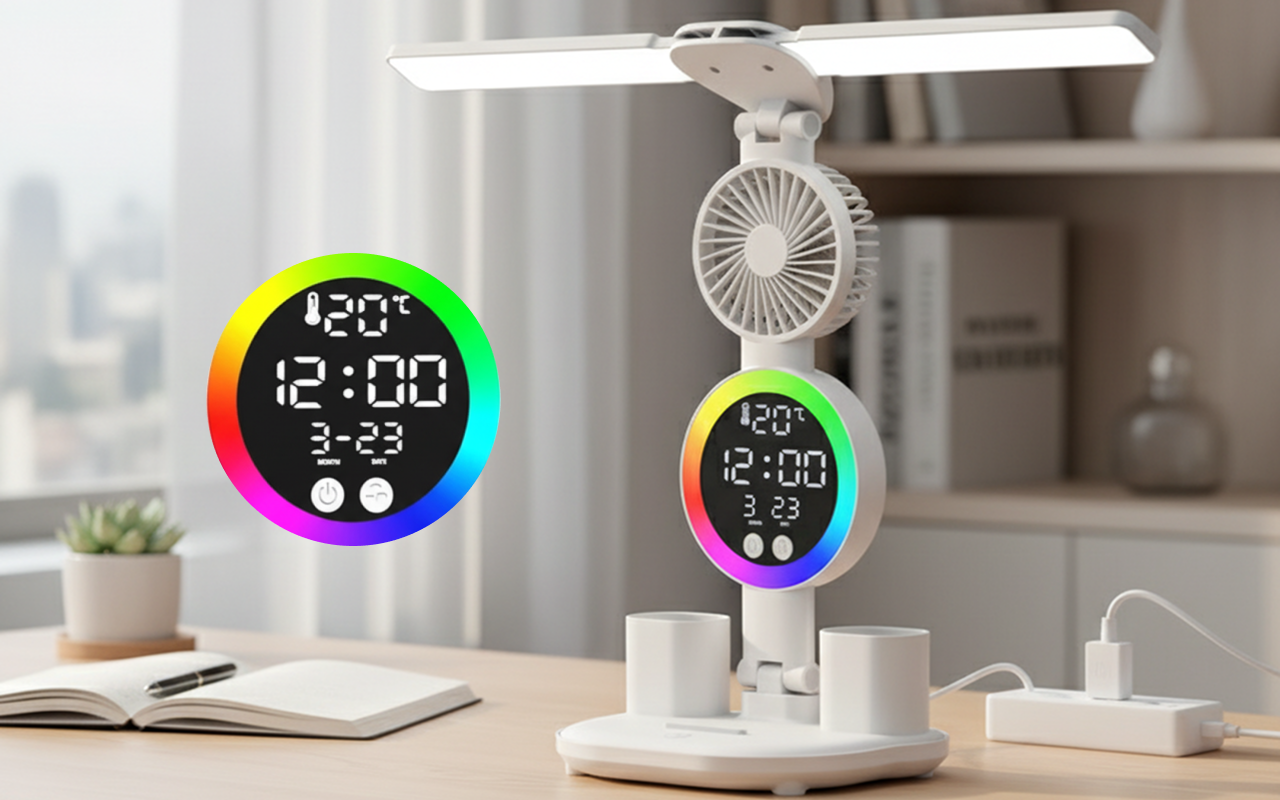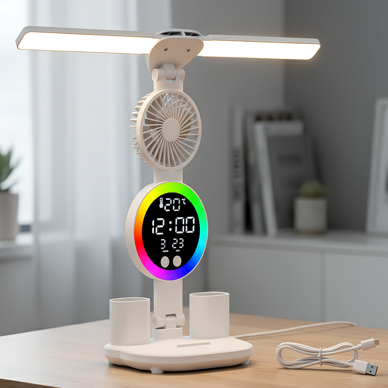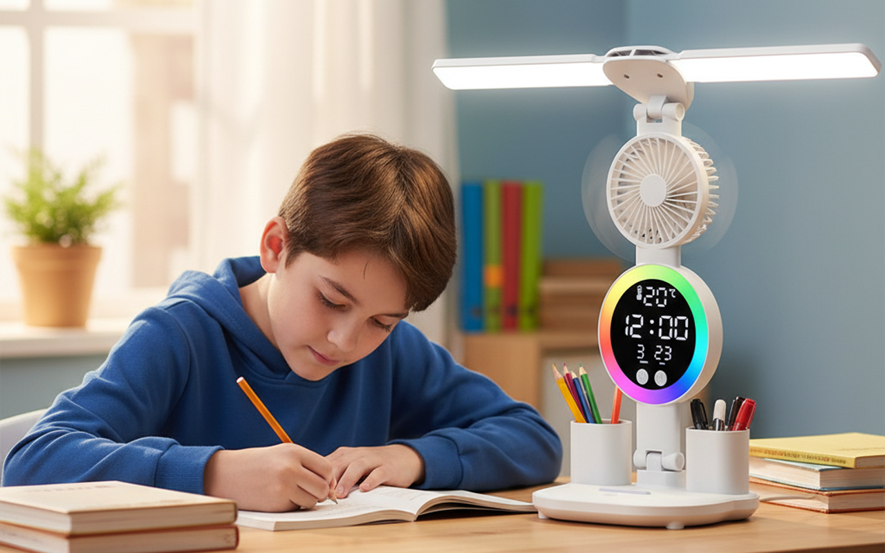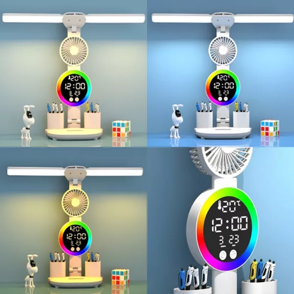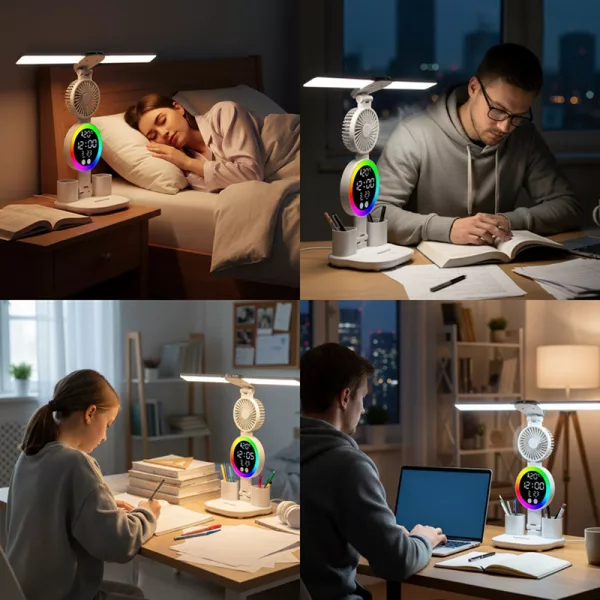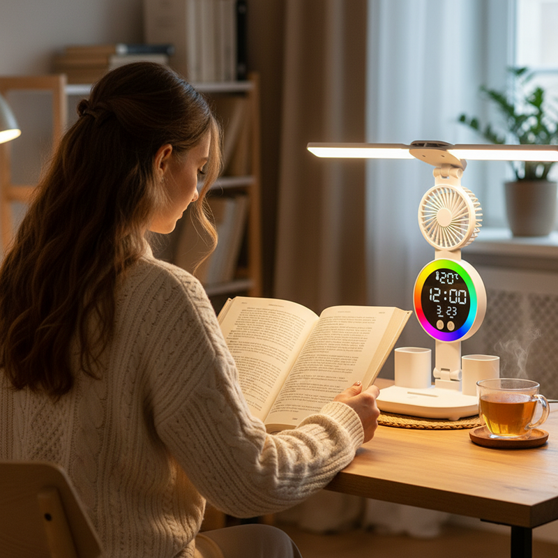 Diese Lampe hat mein Lernen verändert. Das Licht tut meinen Augen nie weh und der Ventilator hält mich immer kühl. Ich liebe es auch, wie ich die Uhrzeit leicht ablesen kann.