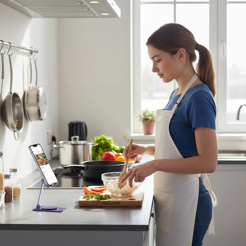 Als jemand mit Nackenschmerzen schätze ich diesen Ständer sehr. Ich kann ihn schnell höher oder niedriger stellen und mein Handy bleibt bei langen Scroll‑Sitzungen stabil.