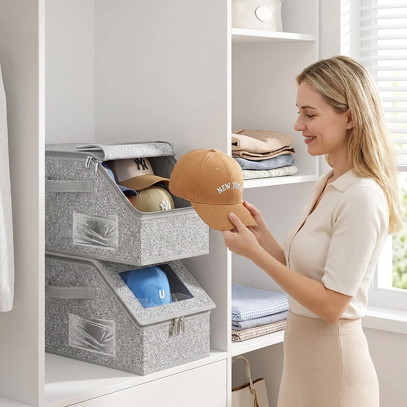 Ich liebe es, dass ich sehen kann, was drin ist, ohne etwas zu öffnen. Meine Hüte bleiben staubfrei und sauber, und ich habe mehr Platz für weitere Sachen im Regal.