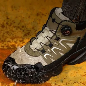 Stahlverstärkung schützt die Zehen vor herabfallenden Werkzeugen oder Schmutz. Die durchtrittsichere Sohle verhindert, dass scharfe Gegenstände die Füße erreichen.