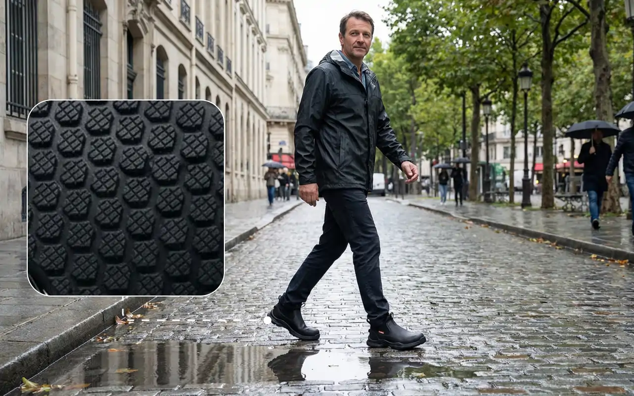 Nasse Böden oder verschüttete Flüssigkeiten führen drinnen nicht mehr zu plötzlichen Stürzen. Zuverlässige Sohlen helfen, Unfälle bei der Arbeit oder zu Hause zu verhindern.