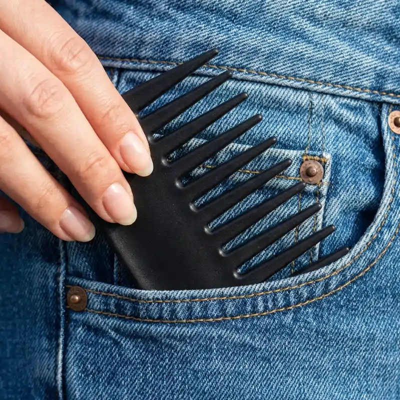 Ich trage diesen Taschenkamm jetzt überall mit mir herum. Er passt direkt in meine Jeans und entwirrt Knoten, ohne zu ziehen. Super sanft und bleibt nie in meinen Locken hängen!