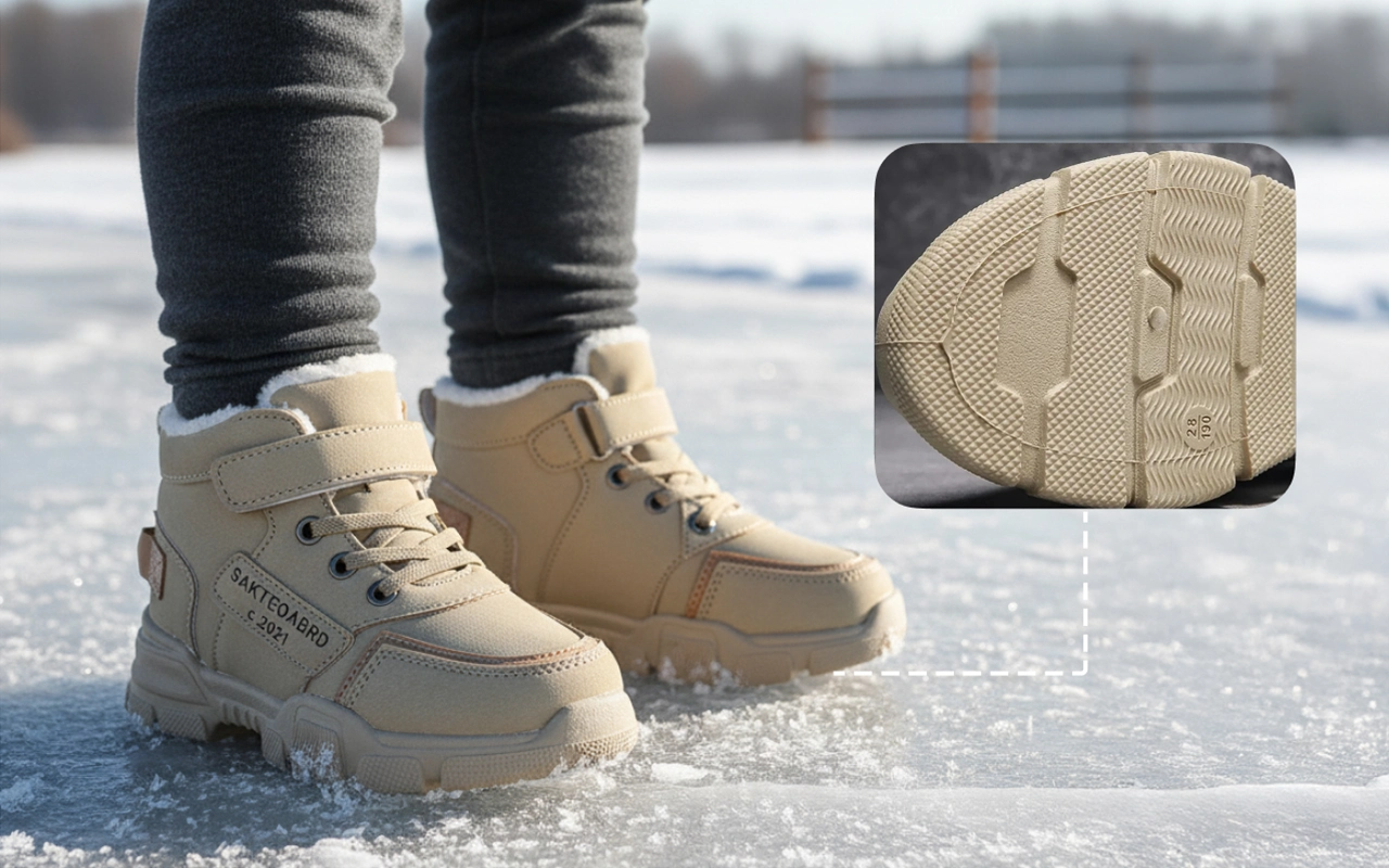 Spezielle Sohlen sorgen für festen Halt und verhindern ungewollte Stürze. Kinder können draußen sicher laufen, rennen und springen – auch auf rutschigen Flächen.