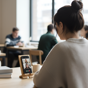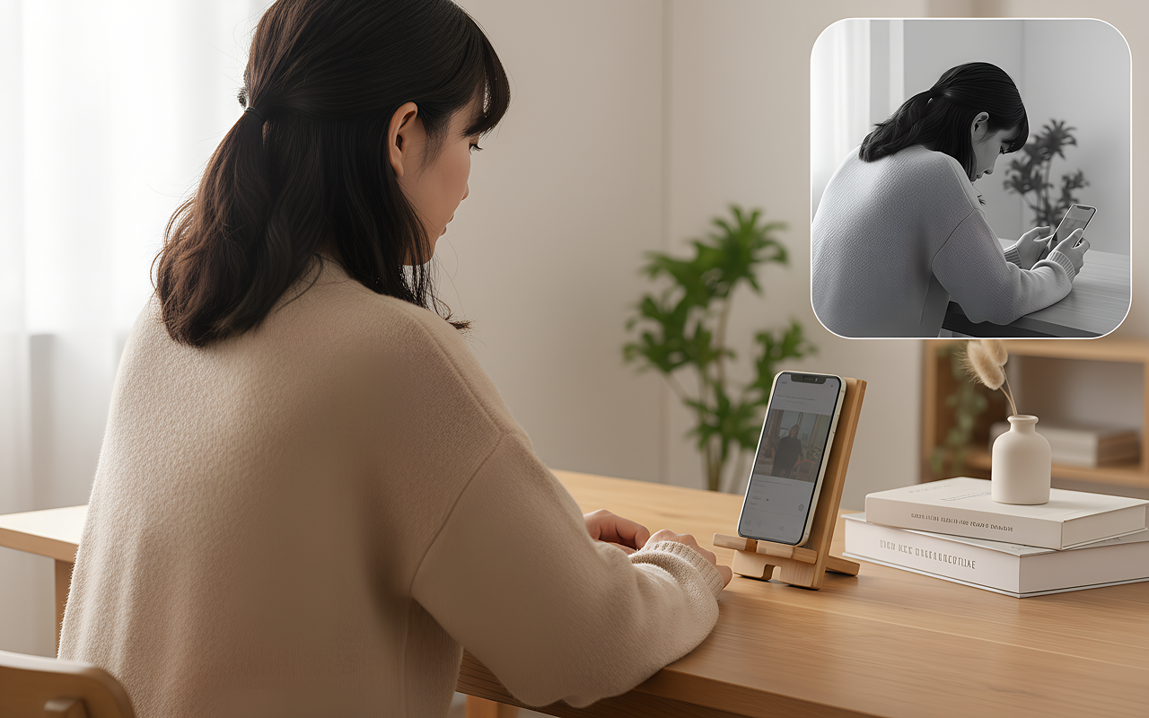 Dieser Holzhalter hält mein Handy stabil für Online-Unterricht. Meine Hände sind frei zum Mitschreiben und mein Nacken tut nicht mehr weh!